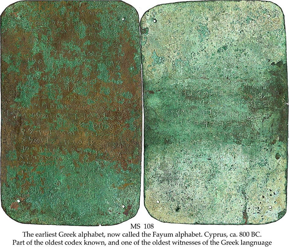 L'immagine è una visualizzazione dell'abbecedario su tavoletta di Fayyum, rinvenuto in Egitto e realizzato tra il 1245 e l’845 a.C, in cui qualcuno ha scritto ripetutamente un alfabeto di 22 lettere, da destra a sinistra, su quattro diverse placche di rame, rilegate come un libro.